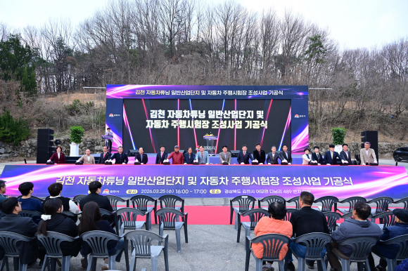 김천시는 25일 주요 기관, 단체, 지역 주민 등 500여 명이 참석한 가운데 「김천 자동차튜닝 일반산업단지 및 자동차 주행시험장 조성사업」의 기공식을 개최하고 미래 모빌리티 산업 기반 구축에 본격적으로 착수했다고 밝혔다.