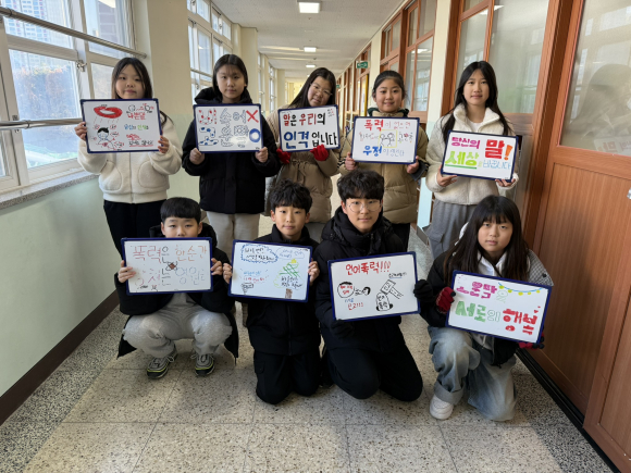 포항해맞이초등학교(교장 천향숙)는 12월 4일(수) 아침 등교시간에 전교 및 학급 학생회 학생들과 학부모회, 학교운영위원회 위원들이 함께 전교학생회 주관 ‘학생 언어 문화 개선 캠페인’을 실시하였다.