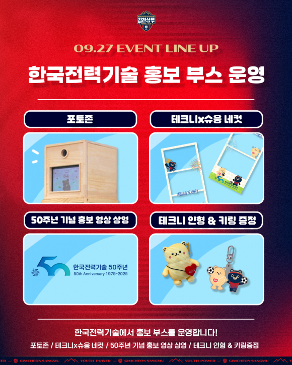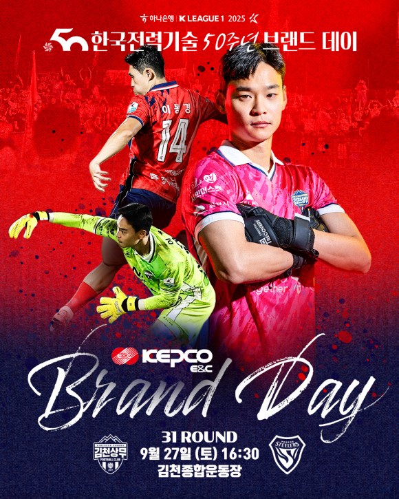 김천상무프로축구단(대표이사 이재하)이 9월 27일 토요일 16시 30분, 김천종합운동장에서 포항스틸러스(이하 포항)와 ‘하나은행 K리그1 2025’ 31R 홈경기를 치른다. 김천상무는 한국전력기술 브랜드데이를 맞아 포항전 맞대결 연승과 함께 리그 2연승을 달린다는 각오다.